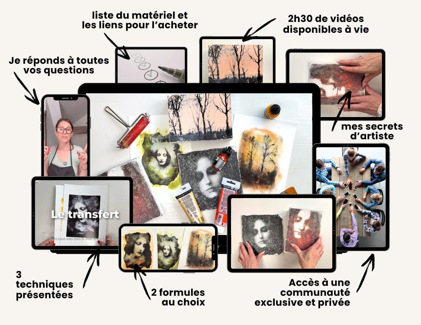 → L’atelier vous donne accès à tous les modules dans une expérience fluide pour découvrir mes trois version du procédé et accéder à mes "secrets" d'artiste". Au terme de votre parcours, vous pourrez envisager mille créations grâce aux transferts jet d'encre.