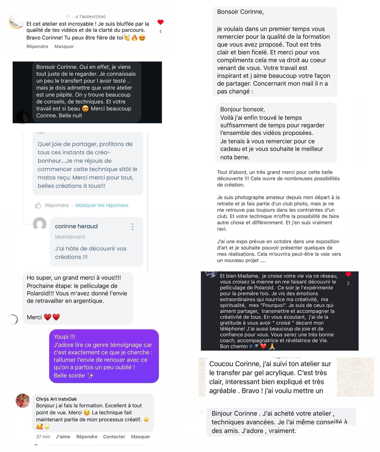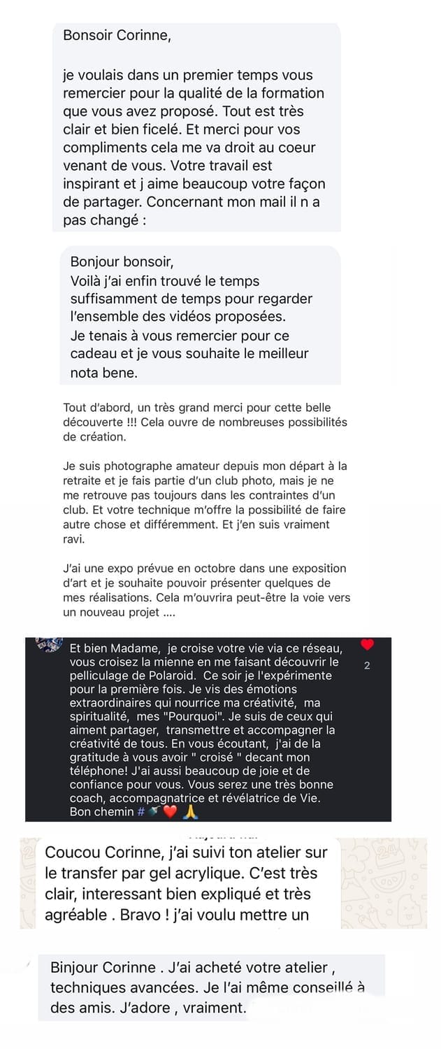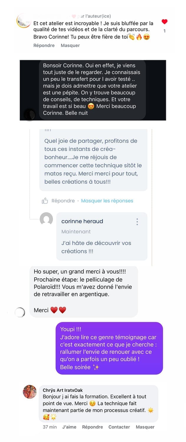 "Beaucoup d’explications claires dans les vidéos, beaucoup de passion et la gentillesse du suivi. Maintenant je vais devoir être TRÈS créative car beaucoup vont pratiquer la technique"